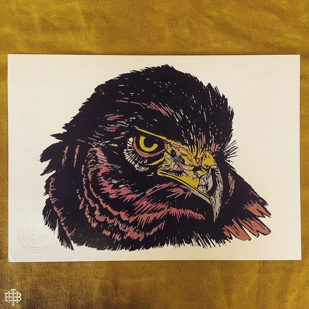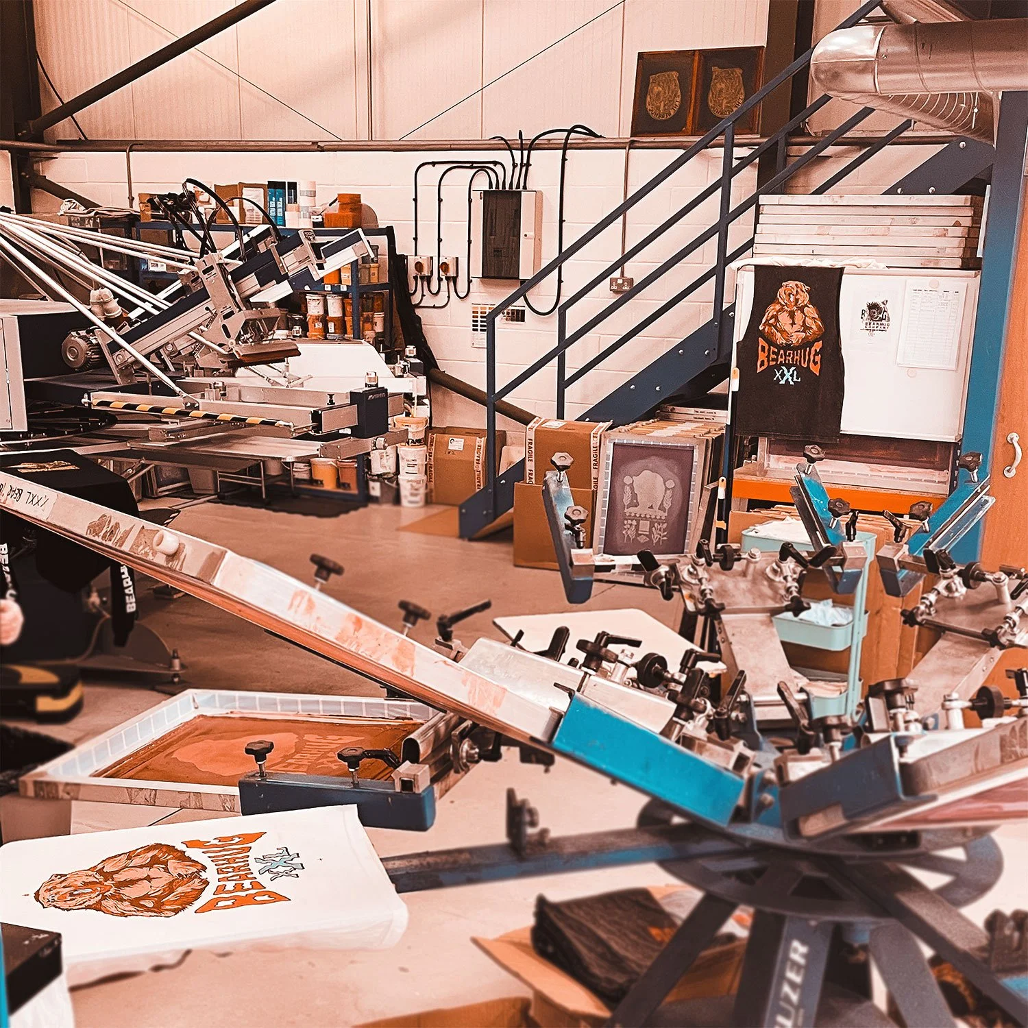 I specialised in print at Northumbria University, mainly focusing on woodcut & lino relief prints. After graduating, I quickly got involved in screenprinting, learning from suppliers, eventually buying my own equipment and printing from a 1-bedroom flat to owning industrial auto-machines—producing thousands of products weekly. Alongside screenprinting, I used various methods and embraced new processes, especially direct-to-garment (DTG) printing. We bought our first DTG machine in 2017 during Bearhug's growth, which allowed us to offer a wider product range with less stock and waste. I’ve always sold prints using giclee, relief, riso, and screenprinting, which remain the foundation of my creative career.